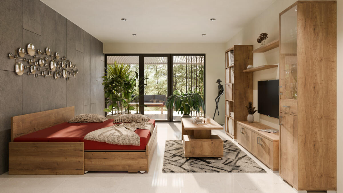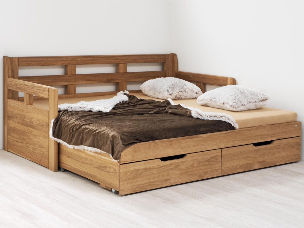 Postele Massimo se vyrábějí v masivním divokém dubu a v masivním buku v několika barevných provedeních. K posteli lze dokoupit zásuvku.